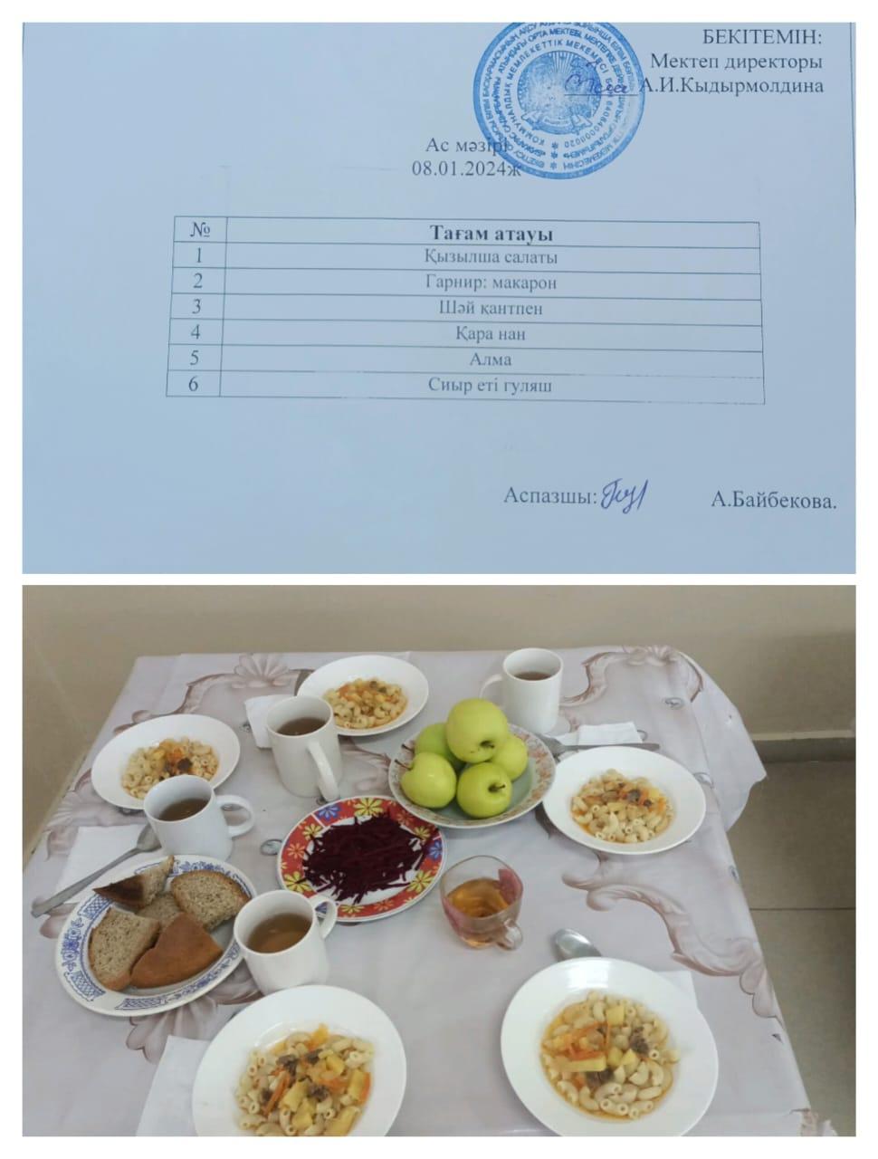 Бижарас Садырбайұлы атындағы орта мектебінің 08.01.2024 жылғы ыстық тамақ мәзірі