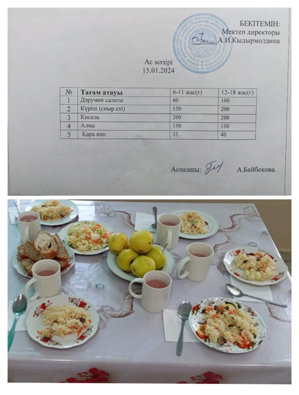 » » Бижарас Садырбайұлы атындағы орта мектебінің 15.01.2024 жылғы ыстық тамақ мәзірі