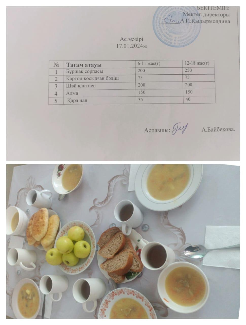 Бижарас Садырбайұлы атындағы орта мектебінің 17.01.2024 жылғы ыстық тамақ мәзірі